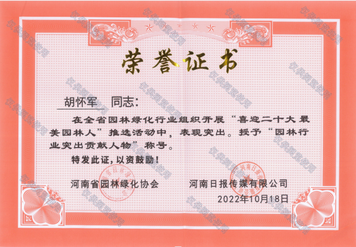 河南省園林綠化協(xié)會副會長、省園林養(yǎng)護管理專業(yè)委員會會長、河南江海園林綠化產(chǎn)業(yè)有限責任公司董事長胡懷軍在全省園林綠化行業(yè)組織開展“喜迎二十大最美園林人”推選活動中,表現(xiàn)突出,榮獲“園林行業(yè)突出貢獻人物”稱號。此次“喜迎二十大最美園林人”活動以踐行習近平總書記新時代生態(tài)文明建設(shè)思想總體部署,堅持以人為本、生態(tài)優(yōu)先、綠化發(fā)展理念,進一步彰顯河南園林綠化從業(yè)人員的新氣象、新風尚營造“發(fā)現(xiàn)先進,學習先進,爭當先進”的濃厚氛圍,充分激發(fā)和調(diào)動全省園林人建設(shè)綠色之城、花園之城、生態(tài)之城的主動性、積極性和創(chuàng)造性,著力凝聚奮發(fā)進取,崇德向上的精神力量,共建共享生態(tài)宜居美麗河南。