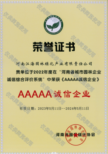 河南江海園林綠化產(chǎn)業(yè)有限責任公司再次榮獲2022年度“河南省城市園林企業(yè)誠信綜合評價系統(tǒng)AAAAA誠信企業(yè)”。企業(yè)的誠信度不斷增強,工程質(zhì)量不斷提高。誠信企業(yè)的榮譽強化了企業(yè)的法律意識和責任意識,規(guī)范企業(yè)經(jīng)營行為、誠信經(jīng)營,引導企業(yè)在市場經(jīng)營中良性競爭,共同可持續(xù)發(fā)展,有效的促進了企業(yè)誠信經(jīng)營的力度,優(yōu)質(zhì)工程越發(fā)增多。