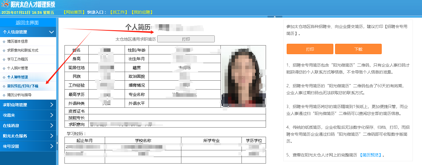 2、電腦登錄太倉人才網(wǎng)個人會員,在“個人信息管理”-》“簡歷預(yù)覽”中也能找到“招聘會專用簡歷打印”。