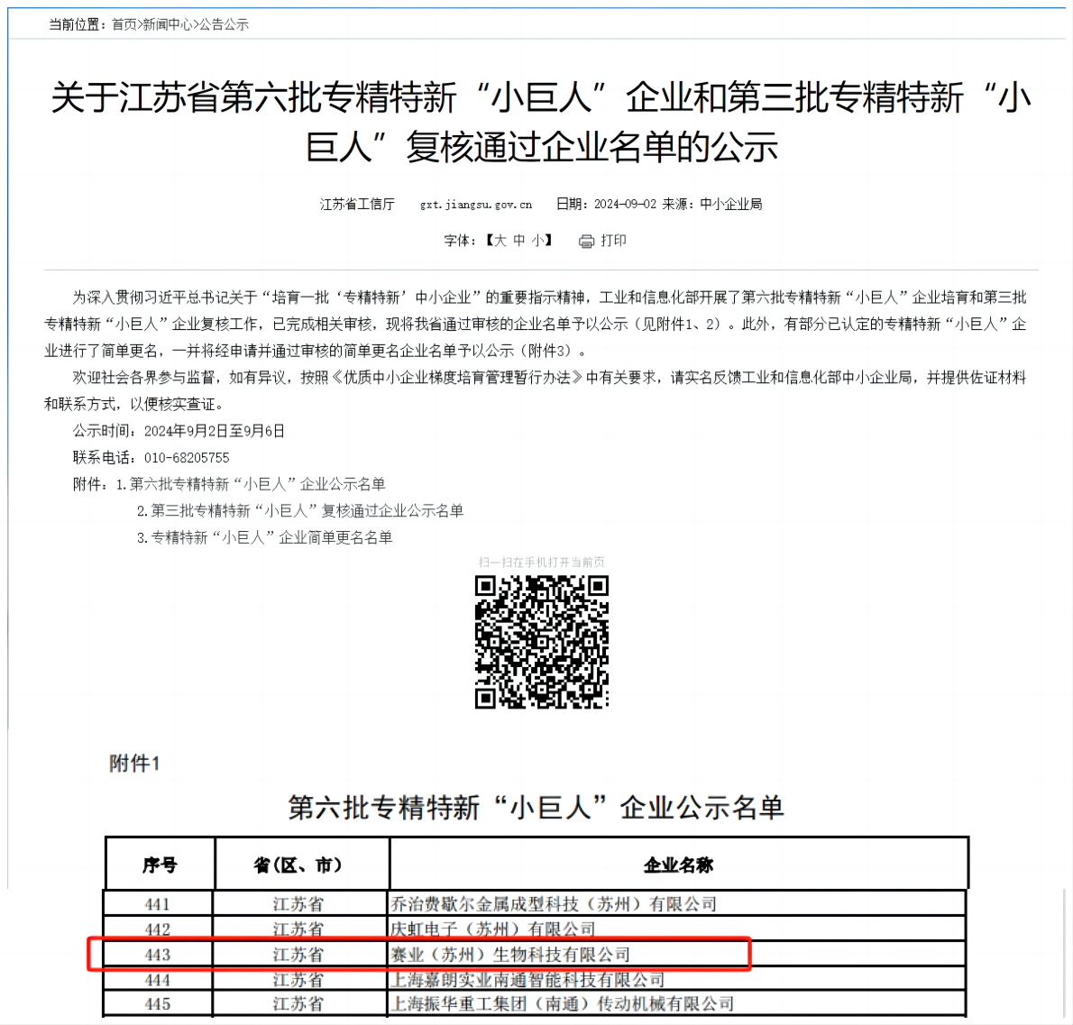 9月2日,根據(jù)工信部統(tǒng)一部署,江蘇省工信廳發(fā)布了《關(guān)于江蘇省第六批專(zhuān)精特新小巨人企業(yè)和第三批專(zhuān)精特新小巨人復(fù)核通過(guò)企業(yè)名單的公示》,其中沙溪企業(yè)賽業(yè)(蘇州)生物科技有限公司成功獲評(píng)第六批專(zhuān)精特新小巨人企業(yè)。 賽業(yè)(蘇州) 生物科技有限公司成立于2011年,是一家專(zhuān)注于基因工程模式動(dòng)物領(lǐng)域的高新技術(shù)企業(yè)。公司以動(dòng)物模型為基礎(chǔ),結(jié)合人工智能術(shù),在基因編輯動(dòng)物模...