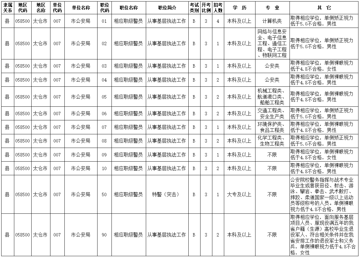 江蘇省2026年度考試錄用公務員公告發(fā)布,如果你有一個熱血的警察夢,想穿上警服書寫藏藍人生。太倉市公安局12個崗位、21個名額期待你的加入! 一、招錄職位信息 點擊圖片放大 三、報名時間 2025年11月4日9:00至11月10日16:00 四、繳費時間 2025年11月4日9:00至11月13日16:00 、筆試時間 公安專業(yè)科目筆試時間 2025年12月6日 下午 14:00-16:00 ...